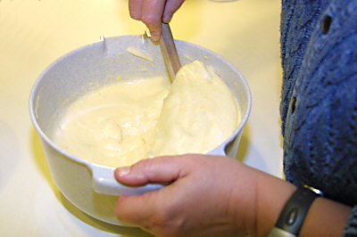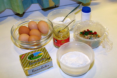 Boter in een schaal goed fijnhakken. In een mixerkom de eiwitten goed stijf kloppen. Daarna in een andere schaal de dooiers met de suiker en citroenrasp kloppen tot ze een lichte kleur hebben gekregen. Meng de vruchtenvulling door de bloem. Doe de geklopte dooiers op de eiwitten en voeg vervolgens (in kleine hoeveelheden tegelijk) de vruchtenvulling en de bloem toe. Spatel het mengsel voorzichtig door elkaar. Vooral niet roeren of mixen. |