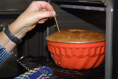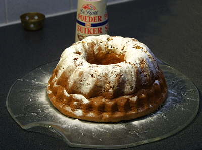Giet de inhoud in een ingevette, en met paneermeel bestrooide, tulbandvorm. Bak de tulband in een voorverwarmde conventionele oven op 175 graden in 45 minuten gaar. Controleer met een saté prikker of de tulband gaar is. Laat de tulband in de vorm even afkoelen en stort deze dan een schaal met bakpapier tegen het vastplakken. Bestrooi de tulband voor het opdienen met poedersuiker. |